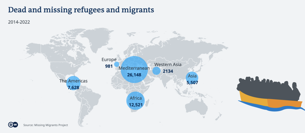More than half of these deaths and disappearances occurred on the Mediterranean route. Since 2014, more than 26,000 refugees and migrants have drowned attempting to cross the sea from Libya, Egypt or Morocco to Europe. This statistic makes the Mediterranean the most dangerous migration route in the world. The second most dangerous region is Africa, and more specifically, the Sahara desert.
