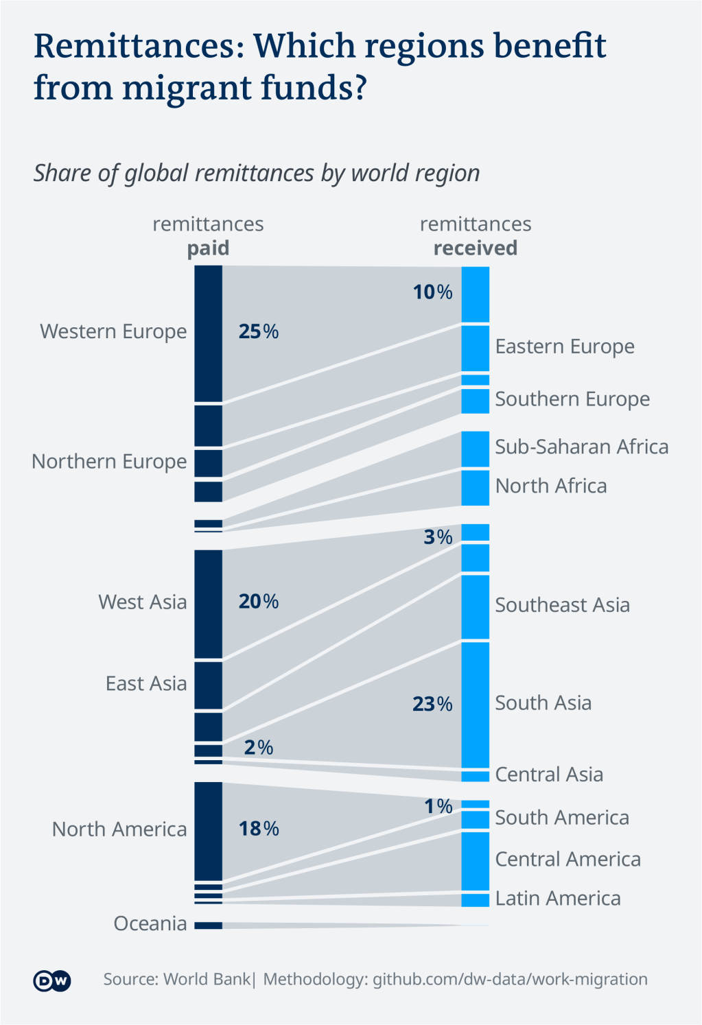 With their remittances, migrant workers don't just provide for their families. They also stabilize entire national economies. In Zimbabwe, Georgia, Nicaragua and Senegal, remittances account for more than 10% of the national economy. In El Salvador, Gambia, Jamaica and Nepal, it's more than 20% and in Kyrgyzstan and Tajikistan it's around 30%.