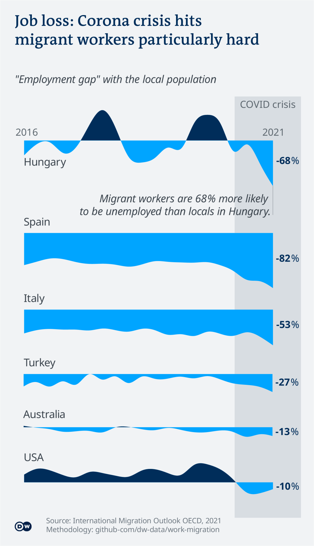 So the pandemic led to a greater financial burden and to severe cuts for migrant workers. Seasonal and migrant workers in particular, who had little legal protection, quickly lost their jobs. The unemployment rate also rose among the local population in many countries. But migrant workers were more affected by layoffs. In some countries with many seasonal workers, such as Hungary, Spain and Italy, a migrant worker was 50% more likely to be unemployed compared to a local worker.