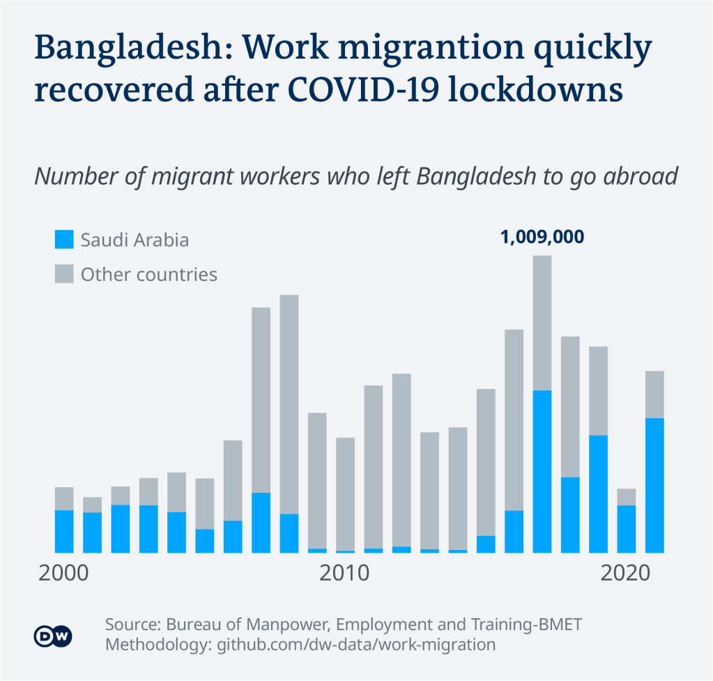 Labor migration out of Bangladesh, however, only took a short term hit from restrictions such as those in Saudi Arabia. The number of workers going abroad decreased by more than two-thirds from 2019 to 2020, the Bangladeshi Bureau of Manpower, Employment and Training documented. But since 2021, the number has risen again sharply.