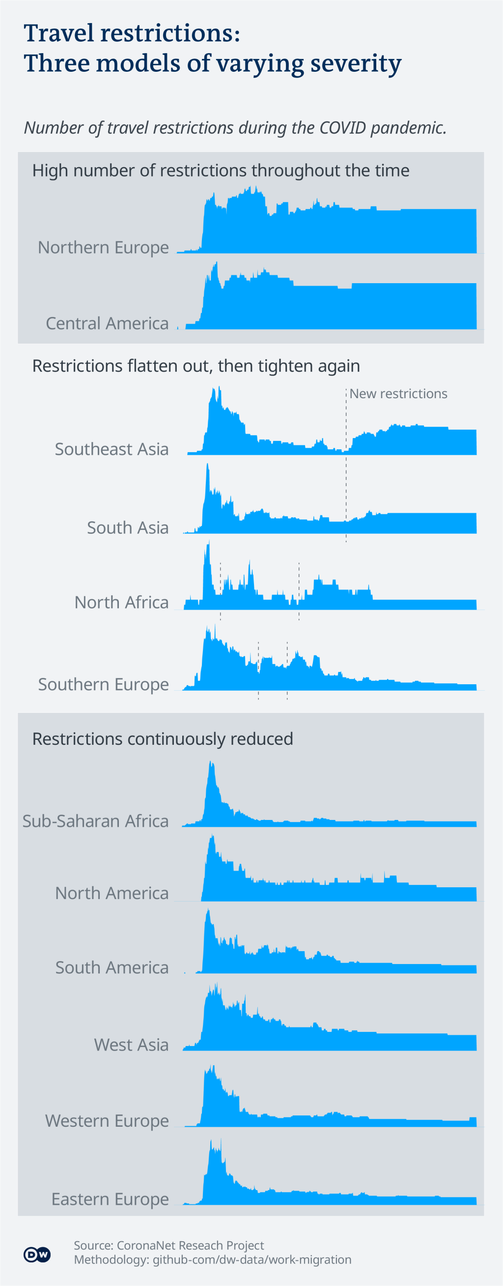 It's unknown whether these people will be able to return to the countries where they were working anytime soon. While at the beginning of the pandemic, virtually all countries in the world closed borders to prevent travel, migration policies have varied since then: Many countries in sub-Saharan Africa quickly lifted regulations, while other European ones such as Spain and Italy tightened travel restrictions after COVID numbers increased.